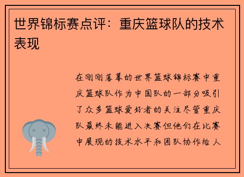 在刚刚落幕的世界篮球锦标赛中,重庆篮球队作为中国队的一部分,吸引了众多篮球爱好者的关注。尽管重庆队最终未能进入决赛,但他们在比赛中展现的技术水平和团队协作,给人留下了深刻印象。本文将从多个角度分析重庆篮球队的技术表现,揭示他们在赛事中的亮点与不足。